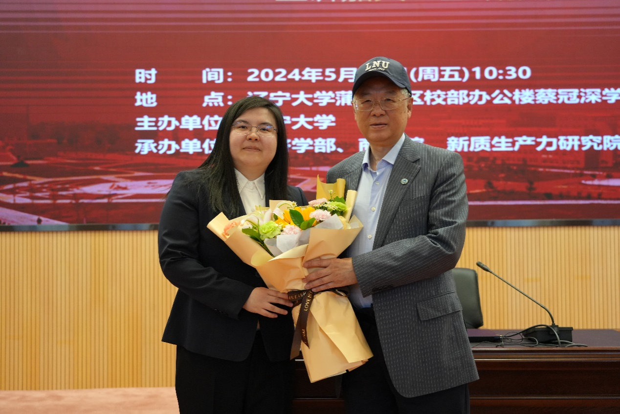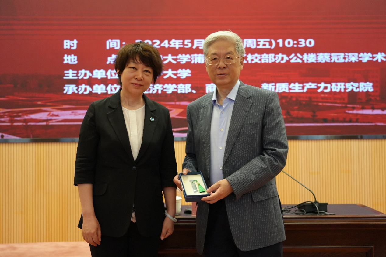 会议最后,余淼杰校长为金碚教授颁发beat365手机版官网宋则行名家大讲堂纪念盘、beat365手机版官网终身名誉教授聘书,beat365手机版官网副书记兼副院长兼纪委书记马晓君教授为金碚教授赠送纪念品,beat365手机版官网副院长韩亮亮教授为金碚教授赠送校帽,beat365手机版官网副院长张广宁教授为金碚教授佩戴校徽,beat365手机版官网徐堇老师为金碚教授献花,与会嘉宾一同合影留念。