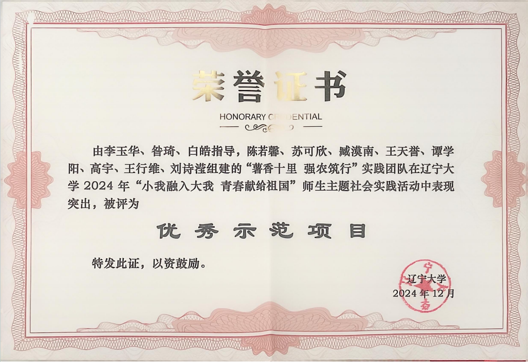 beat365手机版官网“薯香十里 强农筑行”实践团队在beat365手机版官网2024年“小我融入大我 青春献给祖国”师生主题社会实践活动优秀示范项目。