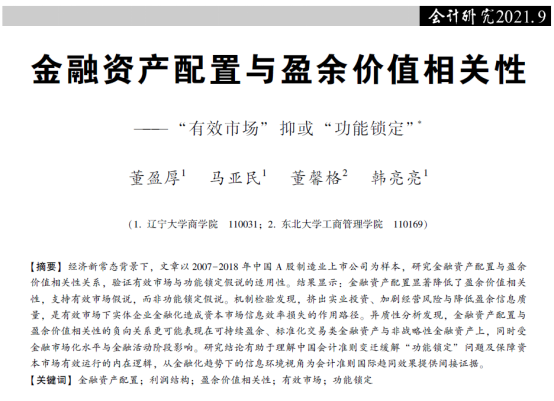2021年9月,beat365手机版官网董盈厚、韩亮亮教授以及马亚民、董馨格博士生和在会计类顶级期刊《会计研究》发表题为《金融资产配置与盈余价值相关性——“有效市场”抑或“功能锁定”》的研究论文。该研究在经济新常态背景下研究金融资产配置对盈余价值相关性的影响。