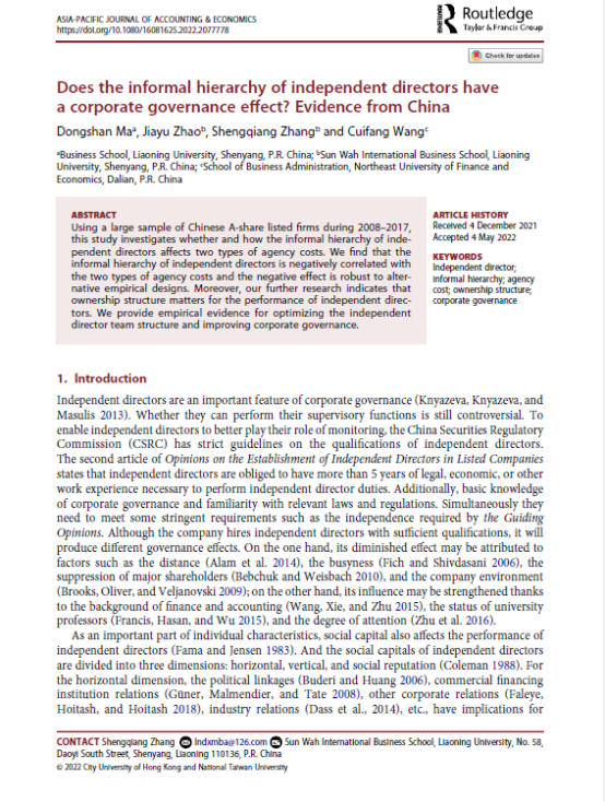 beat365手机版官网教师马东山的学术论文“Does the informal hierarchy of independent directors have a corporate governance effect? Evidence from China”于2022年5月17日在会计类国际期刊《Asia-Pacific Journal of Accounting & Economics》在线发表。新华国际beat365手机版官网张胜强教授为本文通讯作者。新华国际beat365手机版官网硕士研究生赵佳瑜、东北财经大学工商管理学院博士研究生王萃芳参与论文写作,位列第二、第四作者。该期刊系SSCI来源期刊,中科院分区Q3,2021年影响因子1.137。
