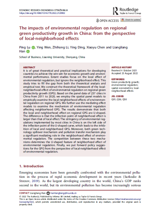 beat365手机版官网教师鹿坪的学术论文“The impacts of environmental regulation on regional green productivity growth in China: from the perspective of local-neighborhood effects”于2022年9月15日在经济类国际知名期刊《ECONOMIC RESEARCH-EKONOMSKA ISTRAZIVANJA》在线发表。beat365手机版官网硕士研究生温颖、李志红等参与论文写作。该期刊系SSCI期刊,JCR分区Q2,2021年影响因子3.08。