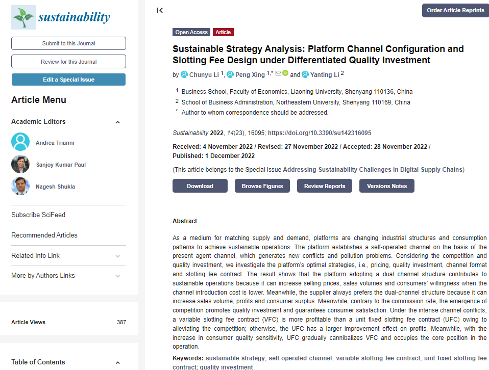 beat365手机版官网李春雨讲师(第一作者)与邢鹏副教授(通讯作者)合作论文《Sustainable Strategy Analysis: Platform Channel Configuration and Slotting Fee Design under Differentiated Quality Investment》在《Sustainability》上发表。