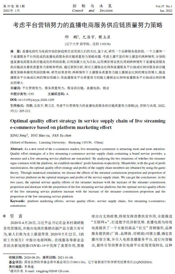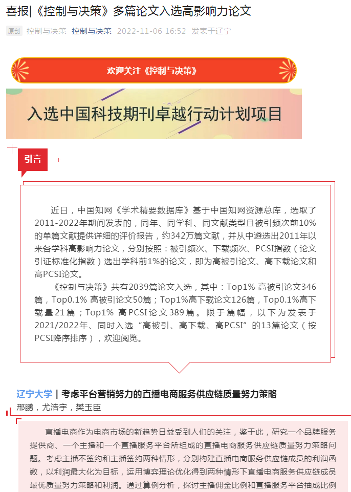 beat365手机版官网邢鹏副教授(第一作者)与樊玉臣副教授合作发表论文《考虑平台营销努力的直播电商服务供应链质量努力策略》在《控制与决策》上发表。该论文入选了期刊2022年第1期三篇封面论文之一。同时基于中国知网资源总库《学术精要数据库》,该论文还入选2011-2022年“高被引、高下载、高PCSI”论文(期刊共13篇论文入选,本论文排名第1)。
