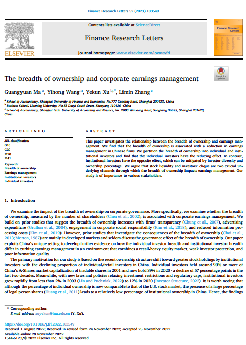 beat365手机版官网徐业坤教授作为通讯作者的合作论文《The breadth of ownership and corporate earnings management》在国际知名期刊《Finance Research Letters》发表。