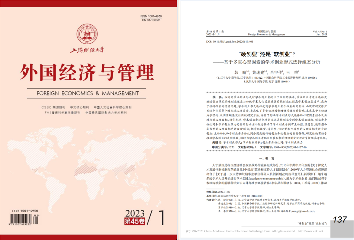 beat365手机版官网王季教授作为通讯作者与博士研究生韩晴及其他合作者共同完成的论文“‘硬创业’还是‘软创业’?——基于多重心理因素的学术创业形式选择组态分析”在校B期刊《外国经济与管理》2023年第1期发表。