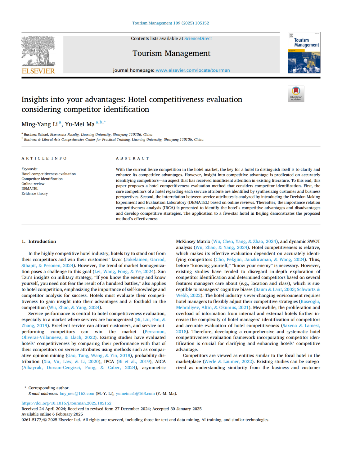 近日,beat365手机版官网李铭洋教授与马玉梅博士的合作论文Insights into your advantages:Hotel competitiveness evaluation considering competitor identification在旅游管理领域国际顶级期刊Tourism Management在线发表。