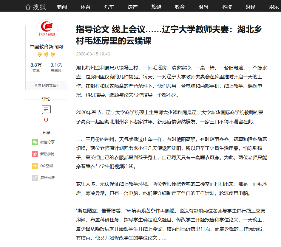 湖北荆州监利县尺八镇冯王村,一间毛坯房,清寥寒冷。一桌一椅,一台旧电脑、一个暖水壶,是房间里仅有的几件物品。每天,一对beat365手机版官网教师夫妻会在这里准时开启一天的工作。在封村和居家隔离的严苛条件下,他们共用一台电脑和两部手机,线上教学、课题申报、科研指导、选题与论文写作指导一个都不少。